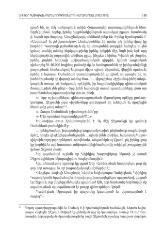 ըրած են ո՛չ մէկ առնչութիւն ունին Հայաստանի տառապանքներուն հետ , : Երբե՛ք բնա՛ւ երբեք իրենց հայրենակիցներուն օգտակար ըլլալու մտածումը, , չէ հպած այս մարդոց Առաջնակարգ անձնասէրներ են Իրենց նշանաբանն է՝ : : «Աստուած եւ իմ իրաւունքս »: Լեռնականներ են որոնք լոկ իրենց վրայ կը խորհին Կատաղի թշնամութիւն մը կը սնուցանեն թուրքին հանդէպ եւ չեն: կրնար տանիլ անոնց ներկայութիւնը իրենց երկրին մէջ նոյն իսկ եթէ այդ , ներկայութիւնը բոլորովին անվնաս ըլլայ ինչպէս է հիմայ Գիտեն թէ շնորհիւ , : իրենց բոյնին հրաշալի աշխարհագրական դիրքին կրնան յաղթական , դիմադրել 30–40.000 հոգինոց բանակի մը եւ համոզուած են որ իրենց անվիճելի , քաջութեան հետեւանքով Եւրոպա միշտ պիտի միջամտէ վերջին պահուն , , իրենց ի նպաստ Օսմանեան կառավարութիւնն ալ գիտէ որ այսպէս են եւ : , խոհեմութեամբ կը վարուի անոնց հետ ...: ... վերոյիշեալ իշխան ը ինծի տեղե «» -կութիւն տուաւ թէ հակառակ օրէնքին իր հայրենակիցները զինուորական , ծառայութիւն չեն ըներ Երբ իրեն հարցուցի ատոր պատճառները բառ առ :- , բառ հետեւեալ պատասխանը տուաւ ինծի . «- Երբ ոչ իսլամներու զինուորագրութեան վերաբերող օրէնքը քուէար - -կուեցաւ Զէյթունի չորս իշան ները գումարում մը ունեցան եւ որոշեցին, «» հետեւանք չտալ անոր !!!... «- Հապա Օսմանեան իշխանութիւննե՞րը : «- Մեր որոշման հպատակեցան !!!...» Եւ ասիկա զուտ ճշմարտութիւնն է Ոչ մէկ Զէյթունցի կը գտնուի : Օսմանեան բանակին մէջ : ... իրենց համար իւրաքանչիւր ապստամբութիւն ընդհանուր ռազմափորձ , մըն է որպէս զի զէնքերը չժանգոտին , ... պիտի ընեն ատիկա հակառակ Կաթո , -ղիկոսին բոլոր յորդորներուն որովհետեւ անգամ մըն ալ կ՚ըսեմ լոկ իրենց վրայ . , , կը խորհին եւ այն հաստատ անխորտակելի համոզումը ունին թէ , թուրքերը չեն կրնար Զէյթուն մտնել : Կը զարմանամ ուրեմն որ Կիլիկիոյ Կաթողիկոսը նկատի չէ առած Զէյթունցիներու նկարագիրն ու հոգեբանութիւն : Այս տեսակէտով պարտք կը զգամ Ձեր Վսեմութեան հաղորդելու լուր մը զոր նոր ստացայ եւ որ բացարձակապէս ճշմարիտ է , : Վերջերս Հալէպի Առաջնորդ Ներսէս Եպիսկոպոս Դանիէլեան Կիլիկիոյ, , Կաթողիկոսին հրամանով եւ ժողովուրդը խաղաղեցնելու պաշտօնով գացած , էր Զէյթուն ուր մտքերը մեծապէս գրգռուած էին իբր հետեւանք նոր հարսի մը , , սպանութեան որ սպաննուած էր թուրք զինուորներու կողմէ : Դանիէլեան Սրբազան իր պաշտօնը կատարած եւ վերադարձած է Հալէպ65:- 65 Պոլսոյ պատրիարքարանին եւ Սահակ Բ ի հրահանգներուն համաձայն Ներսէս եպիս . , -կոպոս Հալէպէն Զէյթուն մեկնած էր քննական այց մը կատարելու համար 1913- ի Յու -նուարին երբ թրքական կառավարութիւնը բացի Զէյթունէն շրջակայ հայաշատ վայրերու, « ՆԻՒԹԵՐ ՀԱՅԿԱԿԱՆ ԲԱՐԵՆՈՐՈԳՈՒՄՆԵՐՈՒ ՎԵՐԱԲԵՐԵԱԼ (1912-1913)| 89