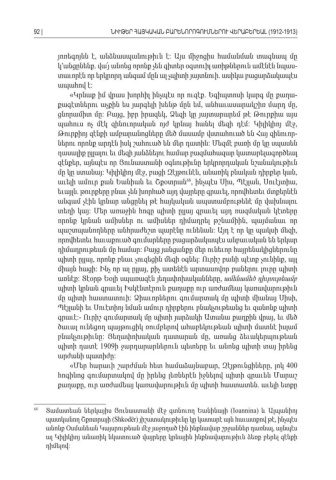 յոռեգոյնն է անձնասպանութիւն է Այս միջոցիս համանման տագնապ մը , : կ՚անցընենք վա՜յ անոնց որոնք չեն գիտեր օգտուիլ առիթներուն ամէնէն նպաս. -տաւորէն որ երկրորդ անգամ մըն ալ չպիտի յայտնուի ասիկա բացարձակապէս . ապահով է : «Կրնաք իմ վրաս խորհիլ ինչպէս որ ուզէք Եգիպտոսի կարգ մը քաղա . -քագէտներու աչքին ես յարգելի խենթ մըն եմ անհաւասարակշիռ մարդ մը , , ցնորամիտ մը Բայց իբր իրազեկ Ձեզի կը յայտարարեմ թէ Թուրքիա այս : , , պահուս ոչ մէկ զինուորական ոյժ կրնայ հանել մեզի դէմ Կիլիկիոյ մէջ : , Թուրքիոյ զէնքի ամբարանոցները մեծ մասամբ վստահուած են Հայ զինուոր -ներու որոնք արդէն իսկ շահուած են մեր դատին Մեզմէ բառի մը կը սպասեն : դասալիք ըլլալու եւ մեզի յանձնելու համար բազմահազար կատարելագործեալ զէնքեր այնպէս որ Յունաստանի օգնութիւնը երկրորդական նշանակութիւն, մը կը ստանայ Կիլիկիոյ մէջ բացի Զէյթունէն անառիկ բնական դիրքեր կան : , , , աւելի ամուր քան Եանիան եւ Շքօտրան 68, ինչպէս Սիս Պէյլան Սուէյտիա , , , եւայլն թուրքերը բնաւ չեն խորհած այդ վայրերը գրաւել որովհետեւ մտքերնէն. , անգամ չէին կրնար անցընել թէ հայկական ապստամբութենէ մը վախնալու տեղի կայ Մեր առաջին հոգը պիտի ըլլայ գրաւել այդ ռազմական կէտերը : որոնք կրնան ամիսներ ու ամիսներ դիմադրել թշնամիին պայմանաւ որ , պաշտպանողները անհրաժեշտ պարէնը ունենան Այդ է որ կը պակսի մեզի : , որովհետեւ հաւաքուած գումարները բացարձակապէս անբաւական են երկար դիմադրութեան մը համար Բայց յանցանքը մեր ունեւոր հայրենակիցներունը : պիտի ըլլայ որոնք բնաւ չուզեցին մեզի օգնել Ուրիշ բանի պէտք չունինք այլ , : , միայն հացի Ինչ որ ալ ըլլայ քիչ ատենէն արտասովոր բաներու լուրը պիտի : , առնէք Տէօրթ Եօլի սպառազէն յեղափոխականները: , ամենամեծ դիւրութեամբ պիտի կրնան գրաւել Իսկէնտէրուն քաղաքը ուր առժամեայ կառավարութիւն մը պիտի հաստատուի Ձիաւորներու գումարտակ մը պիտի միանայ Սիսի : , Պէյլանի եւ Սուէտիոյ նման ամուր դիրքերու բնակչութեանց եւ զանոնք պիտի գրաւէ Ուրիշ գումարտակ մը պիտի յարձակի Ատանա քաղքին վրայ եւ մեծ:- , ծաւալ ունեցող պայթուցիկ ռումբերով ահաբեկութեան պիտի մատնէ իսլամ բնակչութիւնը Յեղափոխական դատարան մը առանց ձեւակերպութեան: , պիտի դատէ 1909 ի ջարդարարներուն պետերը եւ անոնց պիտի տայ իրենց արժանի պատիժը : «Մեր հարաւի շարժման հետ համաձայնաբար Զէյթունցիները լոկ , , 400 հոգինոց գումարտակով մը իրենց լեռներէն իջնելով պիտի գրաւեն Մարաշ քաղաքը ուր առժամեայ կառավարութիւն մը պիտի հաստատեն աւելի ետքը, . 68 Տամատեան ներկայիս Յունաստանի մէջ գտնուող Եանինայի (Ioannina) և Ալպանիոյ պատկանող Շքոտրայի (Shkodër) յիշատակութիւնը կը կատարէ այն հաւատքով թէ ինչպէս , անոնք Օսմանեան Կայսրութեան մէջ յաջողած էին ինքնավար շրջաններ դառնալ այնպէս , ալ Կիլիկիոյ անառիկ նկատուած վայրերը կրնային ինքնավարութիւն ձեռք բերել զէնքի դիմելով:92 |ՆԻՒԹԵՐ ՀԱՅԿԱԿԱՆ ԲԱՐԵՆՈՐՈԳՈՒՄՆԵՐՈՒ ՎԵՐԱԲԵՐԵԱԼ (1912-1913)