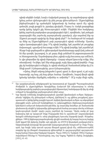 պիտի անցնին Հաճըն էապէս Հայկական քաղաք մը որ ապահովաբար պիտի , , կրնայ յամառ դիմադրութիւն մը ընել թուրք զինուորներուն Զէյթունցիները : ինքնօրէնութիւն կը պահանջեն երկրամասի մը համար որուն մէջ պիտի գտնուին բացի քաղքէն եւ շրջակայ գիւղերէն Մարաշ եւ Հաճըն քաղաքները, , որոնք իրենց երկրէն քիչ հեռաւորութիւն ունին Մերինին հետ համընթաց : իրենց շարժումը բարեբախտ զուգադիպութիւն մըն է որովհետեւ եթէ յոռեգոյն , , պարագային մեր շարժումը յաջողութեամբ չպսակուի գէթ ապահով ենք որ , Զէյթուն լաւագոյն արդիւնք մը ձեռք պիտի բերէ 69: Ես համոզուած եմ սակայն որ մենք ալ Զէյթունցիներուն չափ յաջողութիւն պիտի ունենանք Այստեղ : այլեւս կառավարութիւն չկայ Ի՞նչ պիտի խորհիք եթէ յայտնեմ թէ թուրքերը : , ճակատագրի քըսմէթ, «» ի հաւատքը ունին Ի՞նչ պիտի խորհիք եթէ յայտնեմ թէ : , Տէօրթ Եօլի գայմագամն ու զինուորական հրամանատարը արդէն իսկ շահուած են մեր դատին կաշառքով եւ թէ ցարդ մեզի յանձնած են թղթատարատունն , , ու հեռագրատունը Ապահովաբար բնաւ չպիտի ուզէք հաւատալ այս ամէնուն : , եւ զիս ցնորամիտ մը պիտի ենթադրէք Հազար անգամ իրաւունք ունիք Ձեր :- , տեսակէտով Ես ինքս եթէ Ձեր տեղը ըլլայի ուրիշ կերպ չպիտի խորհէի Բայց:- , , :- քիչ մը համբերութիւն ունեցէք եւ պիտի տեսնէք թէ Տամատեան խենթ մը չէ եւ , Ձեզի ըսած է ճշմարտութիւնը զուտ ճշմարտութիւնը , : «Հիմայ Ձեզմէ ամբողջ խնդրածս է դրամ դրամ եւ միշտ դրամ ո՛չ թէ ուրիշ, , , , նպատակի այլ հաց լոկ հաց գնելու համար Որովհետեւ հացով միայն պիտի, , : , կրնանք երեսնիս ճերմկցնել ամիսներ ու ամիսներ 70: Չէ՞ք ուզեր մեզի օգնել . 69 Այս պարբերութեամբ աներկբայօրէն կը հաստատուի թէ Ազգային Պաշտպանութեան Քոմիթէին եւ զէյթունցիներու ծրագիրները մշակուած էին անջատաբար եւ անոնց համընթացութիւնը բարեդէպ զուգադիպութիւն նկատուելով համակարգումի ճիգ մը տեղի , ունեցած էր ծրագիրները գործադրութեան դնելէ առաջ : 70 Երբ նկատի ունենանք յետզինադադարեան շրջանին ֆրանսական ուժերու ներկայու -թեամբ Կիլիկիոյ մէջ քեմալական ուժերով չեթէներով եւ այլ զինեալ թուրքերով շրջա , -պատուած ու իրենք իրենց բաղդին ձգուած նոյնիսկ ֆրանսական ուժերու ալ անբարեկամ , ընթացքին առջեւ գտնուած հաճընցիներու եւ այնթապցիներու ինքնապաշտպանական կռիւներուն առնչուած մանրամասնութիւններ կը տարուինք մտածելու թէ Տամատեանի , գնահատումը տեղին էր երկարաձիգ դիմադրութեան համար բաւարար սնունդ ունենալու կարեւորութեան մասին՝ որպէս յաջող շարժման մը էատարր Դիտել տանք թէ կար : նախադէպ մըն ալ՝ կապուած Չորք Մարզպանի հետ եւ պատմուած՝ ապստամբական ծրագրէն անհանգստացած եւ անոր ընդդիմացող Երուանդ Աղաթօնի կողմէ Տէօրթեոլ : -ցիներու 1909- ի ինքնապաշտպանութեամբ գիւղին տասնեակ մը հազար հաշուող հայերը մահէ կրցած էին փրկուիլ շնորհիւ այն ալիւրին որ ՀԲԸՄ ի նիւթական յատկացումով եւ , - Ալեքսանտրէթի իտալացի հիւպատոսին կարգադրութեամբ հասցուած էր Չորք Մարզ -պան երբ հազիւ երեք օրուան պաշար մնացած ըլլալով գիւղն մէջ անձնատուութենէ, , տարբեր ելք չէր մնացած հազարաւոր զինուորներէ եւ « պաշըպօզուքներէ պաշարուած » հայոց համար Ե րուանդ Գ րիգոր Աղաթօն ( [] [] , Պոլսոյ 1860- ի Եւ Գահիրէի 1906- ի Բարեգոր -ծականներուն Ծնունդը Եւ Պատմութիւնը , տպ Հայ Դպրոց Պընեէն եւ Ժընէվ Զուիցերիա. , , , [1931], 41–43: ՆԻՒԹԵՐ ՀԱՅԿԱԿԱՆ ԲԱՐԵՆՈՐՈԳՈՒՄՆԵՐՈՒ ՎԵՐԱԲԵՐԵԱԼ (1912-1913)| 93