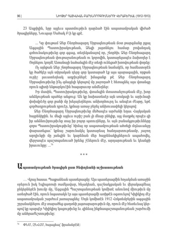 23 Ապրիլին երբ այլեւս պատմութիւն դարձած էին ապստամբական վիժած, ծրագիրները Նուպար Սահակ Բ ի կը գրէ, . . ... Կը փութամ Ձեր Շնորհազարդ Սրբազնութեան մօտ թարգմանը ըլլալ Ազգային Պատուիրակութեան , Ձեզի յայտնելու համար բովանդակ գոհունակութիւնը զոր զգաց տեղեկանալով որ շնորհիւ Ձեր Շնորհազարդ , , Սրբազնութեան փութաջանութեան ու կորովին կատարելապէս ձախողեր է , Յոյներու կողմէ Ատանայի նահանգին մէջ տեղի ունեցած խռովութեան փորձը : Ոչ այնքան Ձեր շնորհազարդ Սրբազնութեան նամակէն որ համեստօրէն , կը ծածկէր այն տիրական դերը զոր կատարած էք այս պարագային որքան , ուրիշ լաւատեղեակ աղբիւրներէ իմացանք թէ Ձեր Շնորհազարդ Սրբազնութիւնը ի՜նչ զմայլելի կերպով մը յաջողած է հեռացնել այս վտանգը որուն պիտի ենթարկուէին հազարաւոր անմեղներ : Իր մասին Պատուիրակութիւնը վտանգին մտատանջութեան մէջ խոր , , , անձկութեան պահեր անցուց Ան կը նախատեսէր այն սոսկալի եւ արիւնալի : փոխվրէժը զոր քանի մը խելայեղներու անխորհուրդ եւ անպէտ ժէսթը եթէ , գործադրութեան դրուէր կրնար առաջ բերել անխուսափելի կերպով , : Ձեր Շնորհազարդ Սրբազնութիւնը մեծապէս արժանի եղաւ Հայկական հայրենիքին եւ մեզի այլեւս ուրիշ բան չի մնար ընելիք այլ մաղթել որպէս զի. , իր անձնուիրութիւնը տայ իր բոլոր պտուղները եւ այն բանակցութիւնները , զորս Պատուիրակութիւնը՝ հիմայ որ ապստամբութեան ահռելի մղձաւանջը փարատեցաւ՝ կրնայ շարունակել կատարեալ հանդարտութեամբ յաջող , արդիւնքի մը յանգին եւ կարենան մեր հայրենակիցներուն ապահովել , վերջապէս պաշտպանուած իրենց շէներուն մէջ արդարութեան եւ կեանքի , իրաւունքը: ... 76 * * * Ապստամբութեան ծրագիրն ըստ Տեփոյեանի աշխատութեան … Վրայ հասաւ Պալքանեան պատերազմը Այս պատերազմին հռչակման առաջին : օրերուն իսկ Եգիպտոսի ռամկավար հնչակեան դաշնակցական եւ վերակազմեալ , , ընկերներէն խումբ մը Ազգային Պաշտպանութեան կոմիտէ անունով միութիւն մը , ստեղծած էին որուն նպատակն էր այս պատերազմի առիթէն օգտուելով Կիլիկիոյ մէջ , ապստամբական շարժում յառաջացնել Սոյն կոմիտէն : 1912 Հոկտեմբերին ազգային շրջանակներու մէջ տարածեց գաղտնի յայտարարութիւն մը որուն մէջ հետեւեալ կեր , -պով կը պարզէր Կիլիկիոյ կացութիւնը եւ զինեալ ինքնապաշտպանութեան շարժումի մը անհրաժեշտութիւնը : 76 ՓՆՄ ԶՆՀՀՄ հայացեալ՝ ֆրանսերէնէ, , : 96 |ՆԻՒԹԵՐ ՀԱՅԿԱԿԱՆ ԲԱՐԵՆՈՐՈԳՈՒՄՆԵՐՈՒ ՎԵՐԱԲԵՐԵԱԼ (1912-1913)